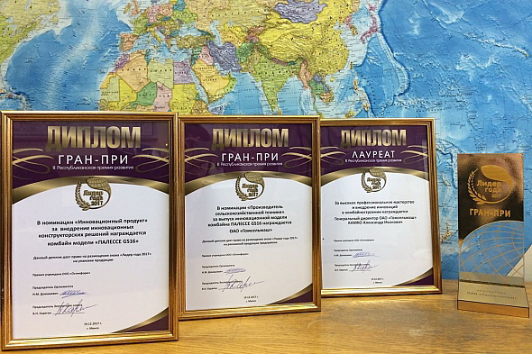 | 2017 | "Leader of the Year 2017" Award: GRAND PRIX diploma in the nomination “Producer of agricultural machinery” for the release of an innovative model of the "PALESSE GS16" combine harvester. GRAND PRIX diploma in the nomination “Innovative product” for the introduction of innovative design solutions for the "PALESSE GS16" combine harvester. Alexander Ivanovich Kamko, General Director of OJSC Gomselmash, was awarded the diploma of the Laureate for high professional skills and innovation in combine engineering. |
