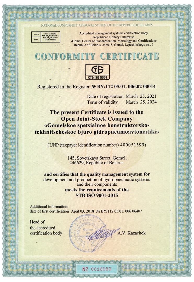 - The branch of OJSC "Gomselmash" Gomel Plant of Special instrument and technological equipment in relation to the production of technological equipment and tools for compliance with STB ISO 9001-2015;